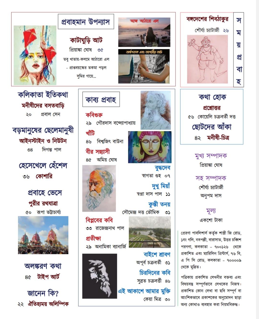 রথযাত্রার পটভূমি শুধু গল্পে নয়, এবারের ‘প্রবাহে ভেসে’র ভ্রমণকাহিনীও পুরীর রথযাত্রা নিয়েই। আর শাক্যসিংহের জন্ম জয়ন্তী উপলক্ষ্যে ‘ম্যাপ পয়েন্টিং’-এ থাকল “দক্ষিণদ্বীপে ধম্মশরণ”-এর বিচিত্র ভ্রমণ অভিজ্ঞতা।